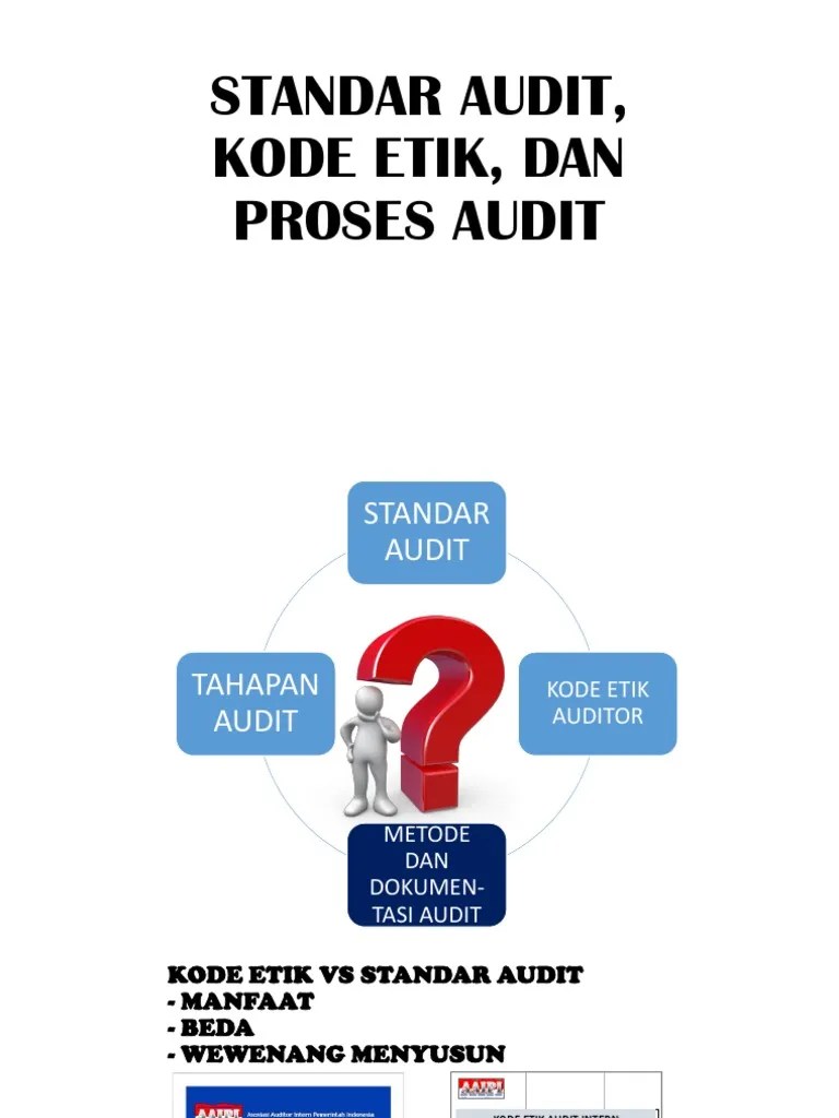 Kode Etik Dan Standar Audit. Asosiasi auditor intern pemerintah indonesia (aaipi). Pengaruh standar audit dan kode etik terhadap pertimbangan tingkat materialitas dalam pemeriksaan laporan keuangan pt. Kode etik dan standar audit bab i pendahuluan kepercayaan masyarakat terhadap suatu profesi ditentukan oleh keandalan, kecermatan, ketepatan waktu, . Standar auditing merupakan bagian dari standar atestasi yang khusus mengatur mutu jasa akuntan publik yang berkaitan dengan pemeriksaan laporan keuangan . Standar, dan kode etik pengawasan intern harus dinyatakan dalam.